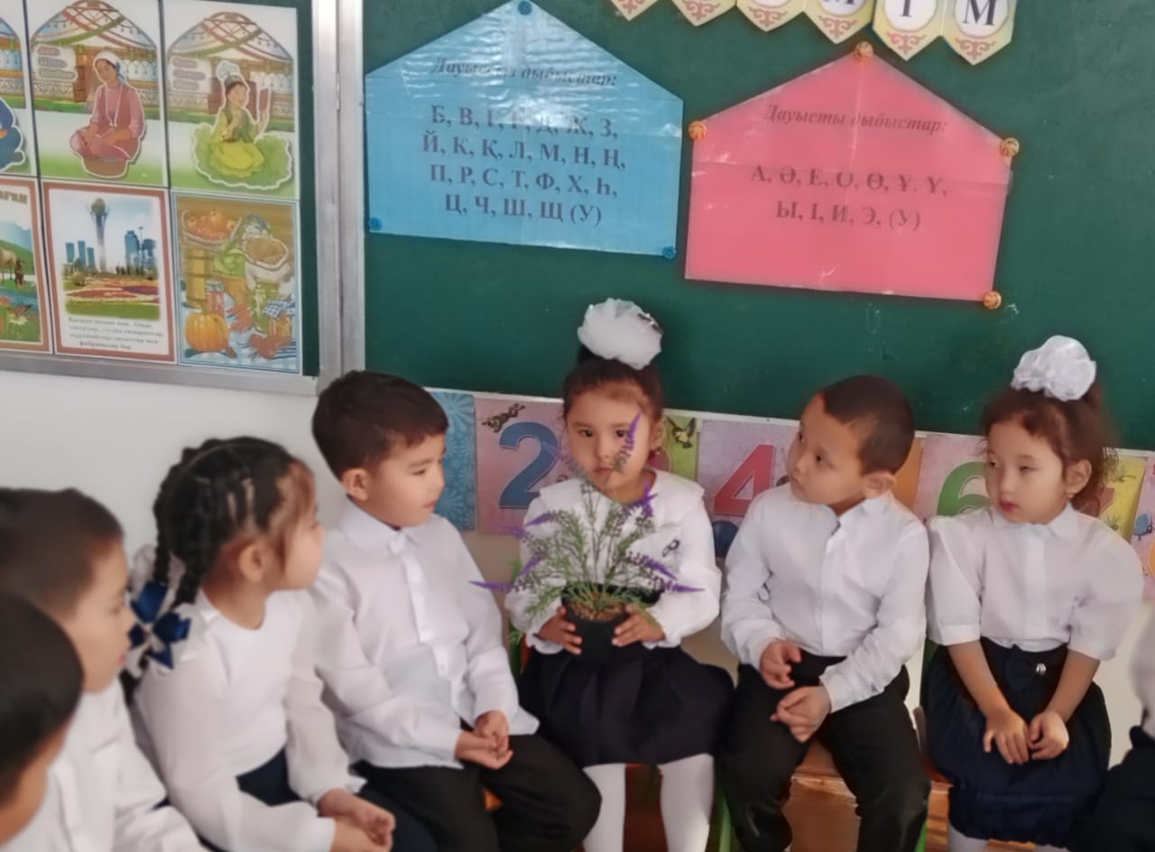 Балаларға сөздерге дыбыстық талдау жасауды , сөздегі дыбыстардың ретін, дауысты және дауыссыз дыбыстарды анықтауды үйрету. Сөздерді буындарға бөлуді, буындардан сөздерді ауызша құрастыруға үйрету. Іс әрекет барысында балалар "Алфавит әлеміне" саяхатқа шықты. Сурет бойынша сөйлемді ауызша талдауды, жәй сөйлемдерді сөзге бөлуді, сөйлемдегі сөздердің ретін анықтауды,берілген сөзге сөйлем құрастыруды үйренді. Іс әрекет барысында Дидактикалық "Сиқырлы әріптер", "Жылы лебіздер" ойындары ойнатылды. Балалар шеңбер бойында отырып ойындарға белсенді қатысып тәрбиеші тарапынан қойылған сұрақтарға жауап берді.