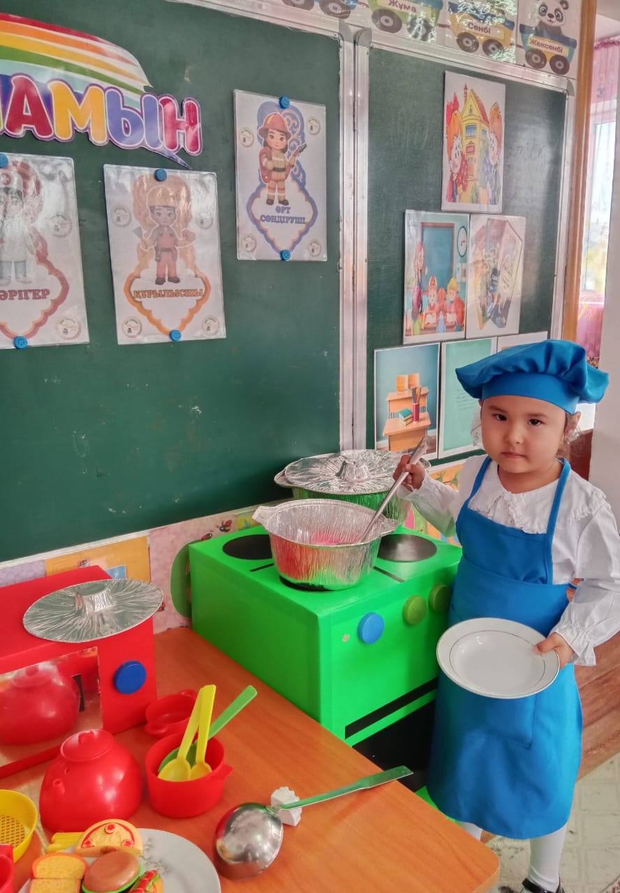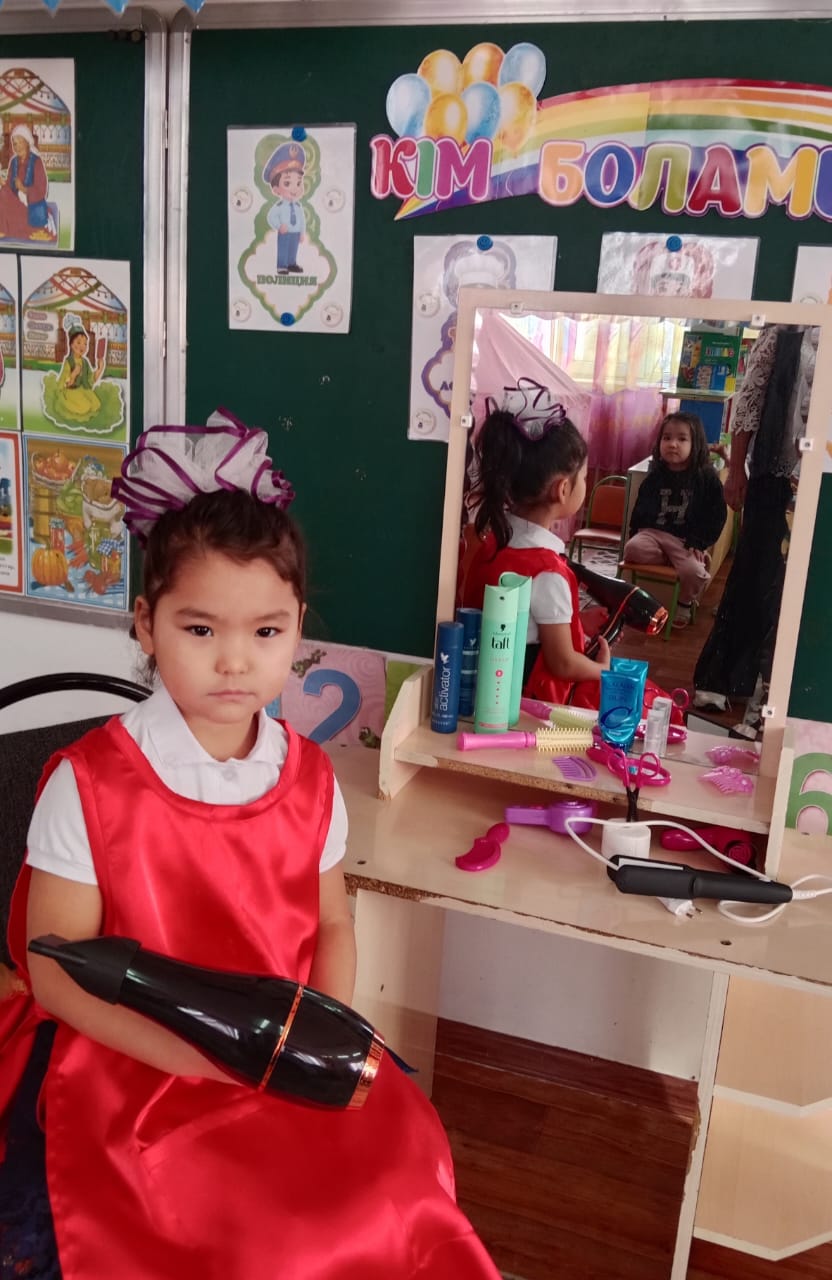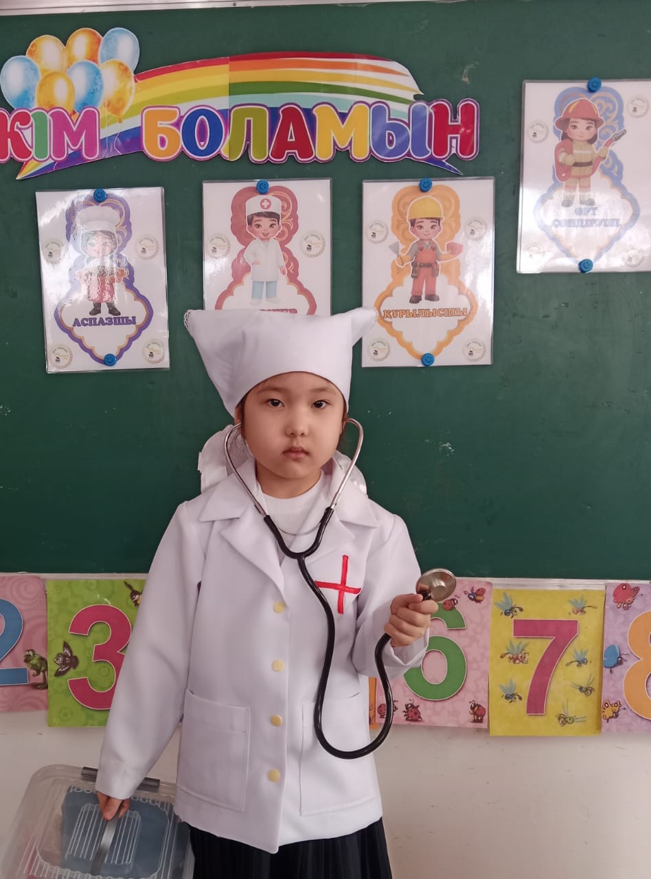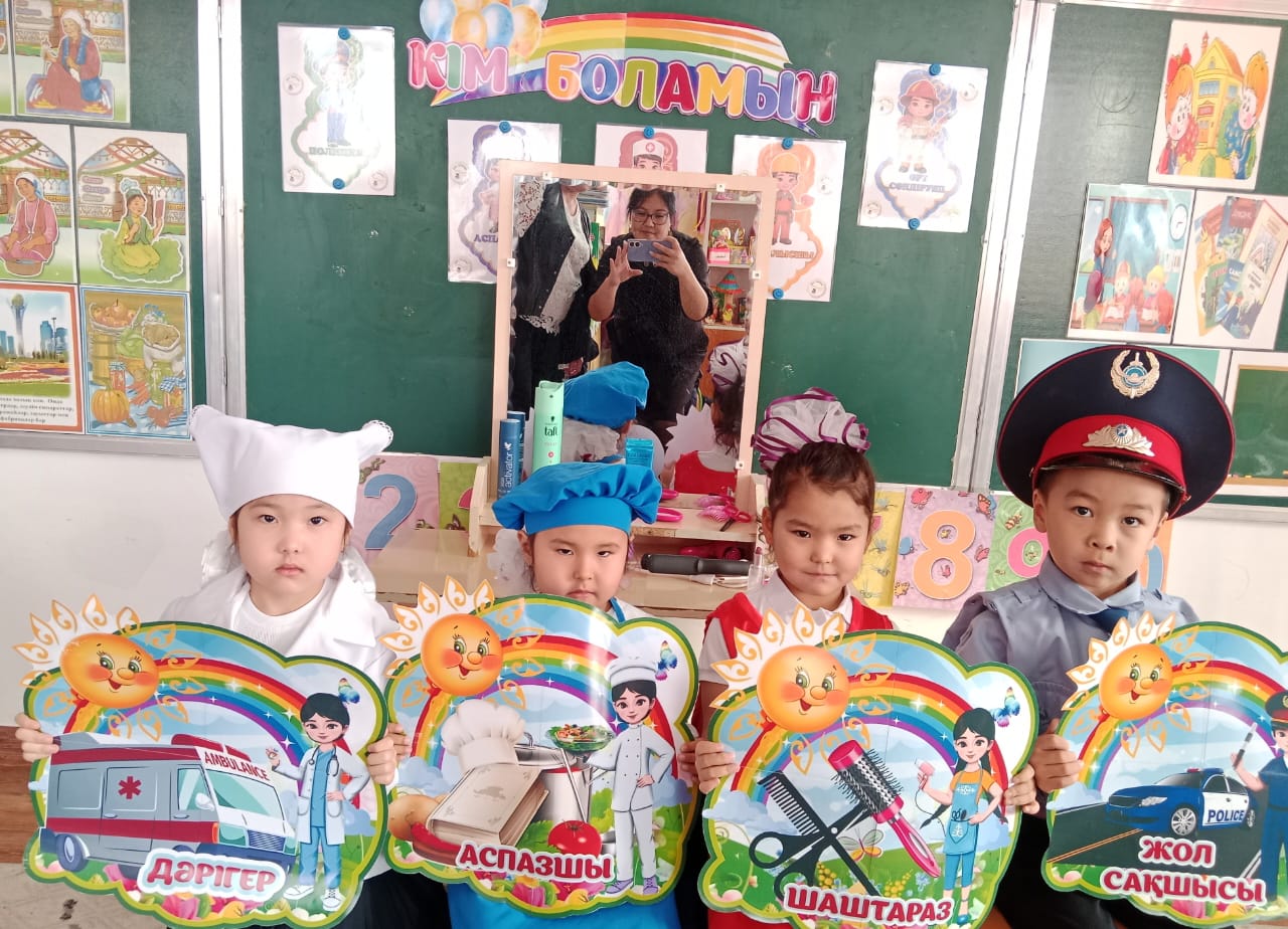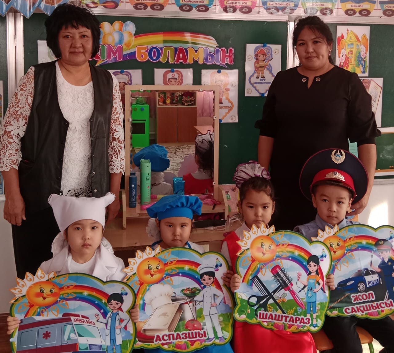 Жақындарының мамандықтарымен таныстыру,олардың атқаратын қызметінің маңызын түсіндіру, ата - анасының мамандықтарына қызығушылықты қалыптастыру. Балалар арасында мамандықтар жайлы "Кім боламын" тақырыбында әңгіме жүргізілді, балаларға үлкендердің еңбегінің нәтижесіне құрметпен қарау керектігі айтылды. Дидактикалық: "Аспазшы", "Дәрігер", "Шаштараз", "Полиция қызметкері" ойындары ойнатылды. Балалар ойындар барысында айналаны қоршаған заттардың, ойыншықтардың адамдардың еңбегімен жасалғанын білді,құралдарға ұқыпты қарауды үйренді .