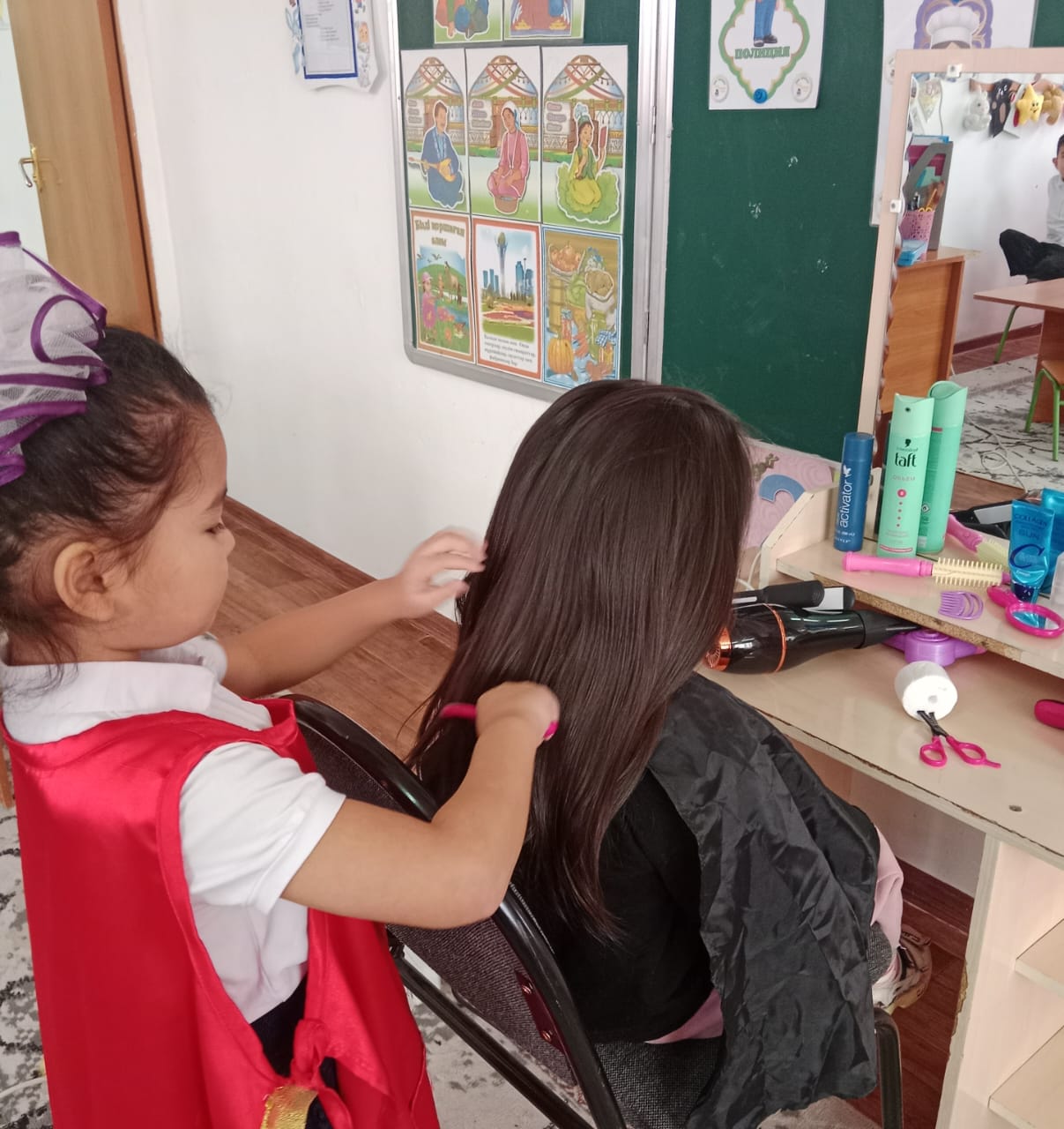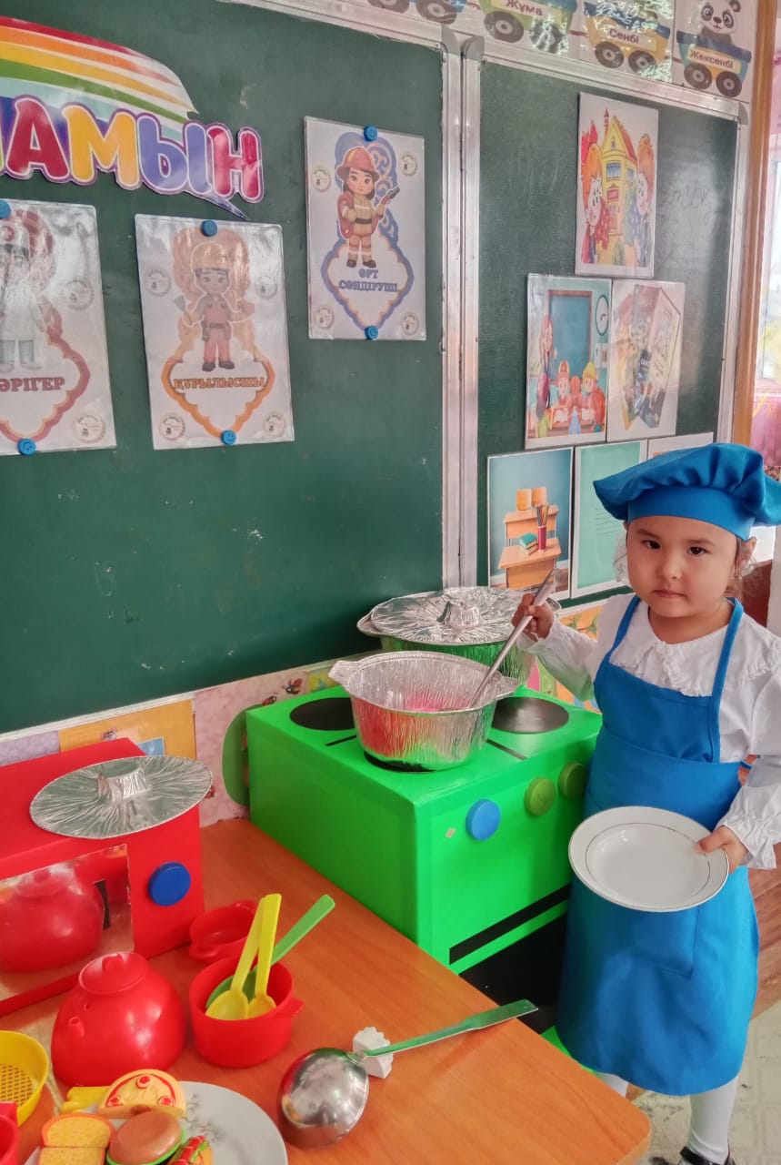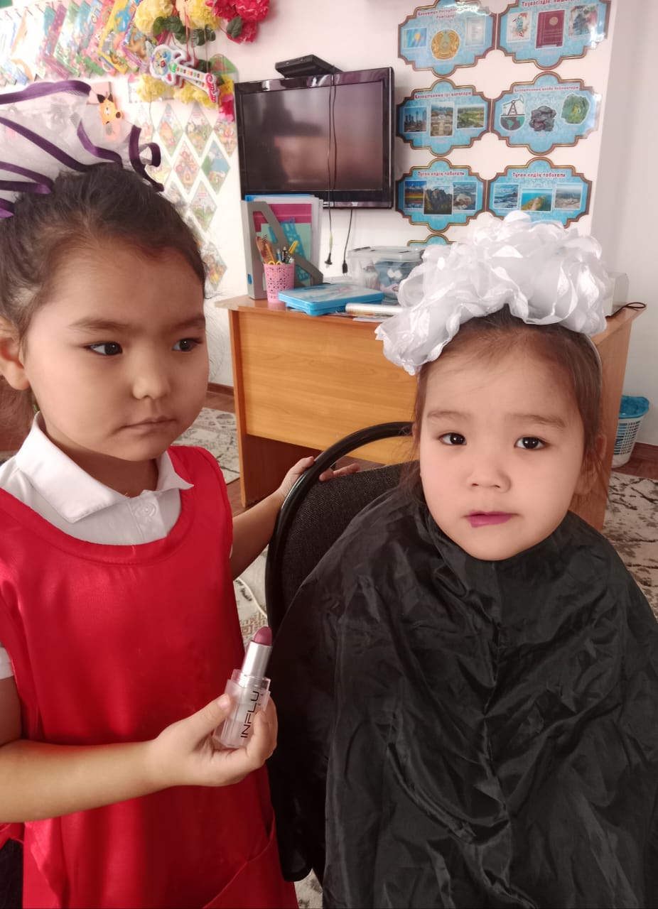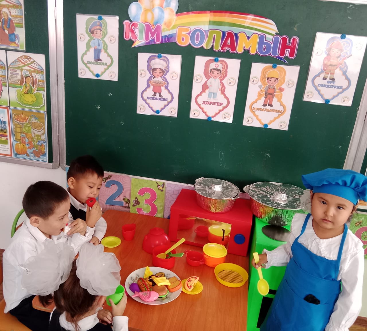 Жақындарының мамандықтарымен таныстыру,олардың атқаратын қызметінің маңызын түсіндіру, ата - анасының мамандықтарына қызығушылықты қалыптастыру. Балалар арасында мамандықтар жайлы "Кім боламын" тақырыбында әңгіме жүргізілді, балаларға үлкендердің еңбегінің нәтижесіне құрметпен қарау керектігі айтылды. Дидактикалық: "Аспазшы", "Дәрігер", "Шаштараз", "Полиция қызметкері" ойындары ойнатылды. Балалар ойындар барысында айналаны қоршаған заттардың, ойыншықтардың адамдардың еңбегімен жасалғанын білді,құралдарға ұқыпты қарауды үйренді .