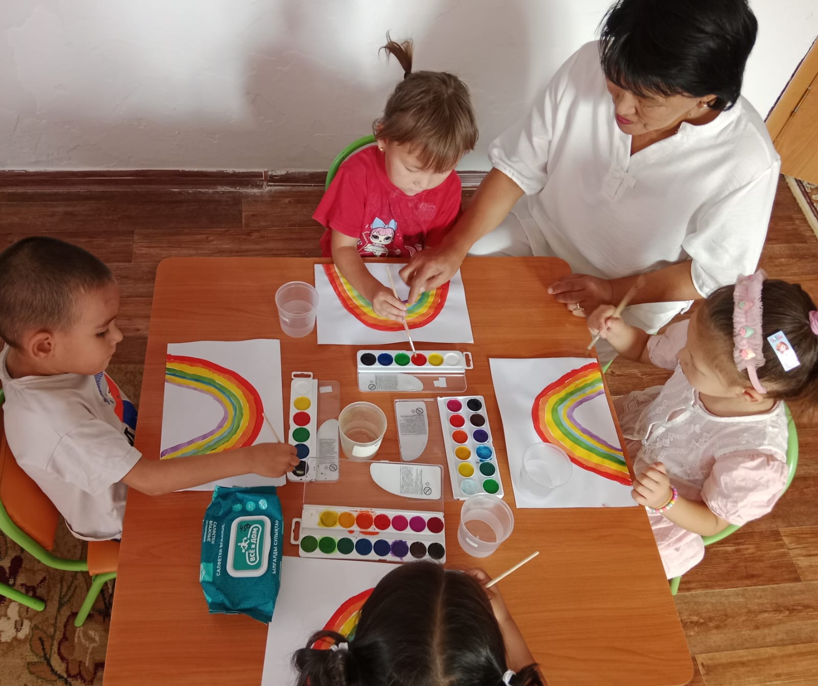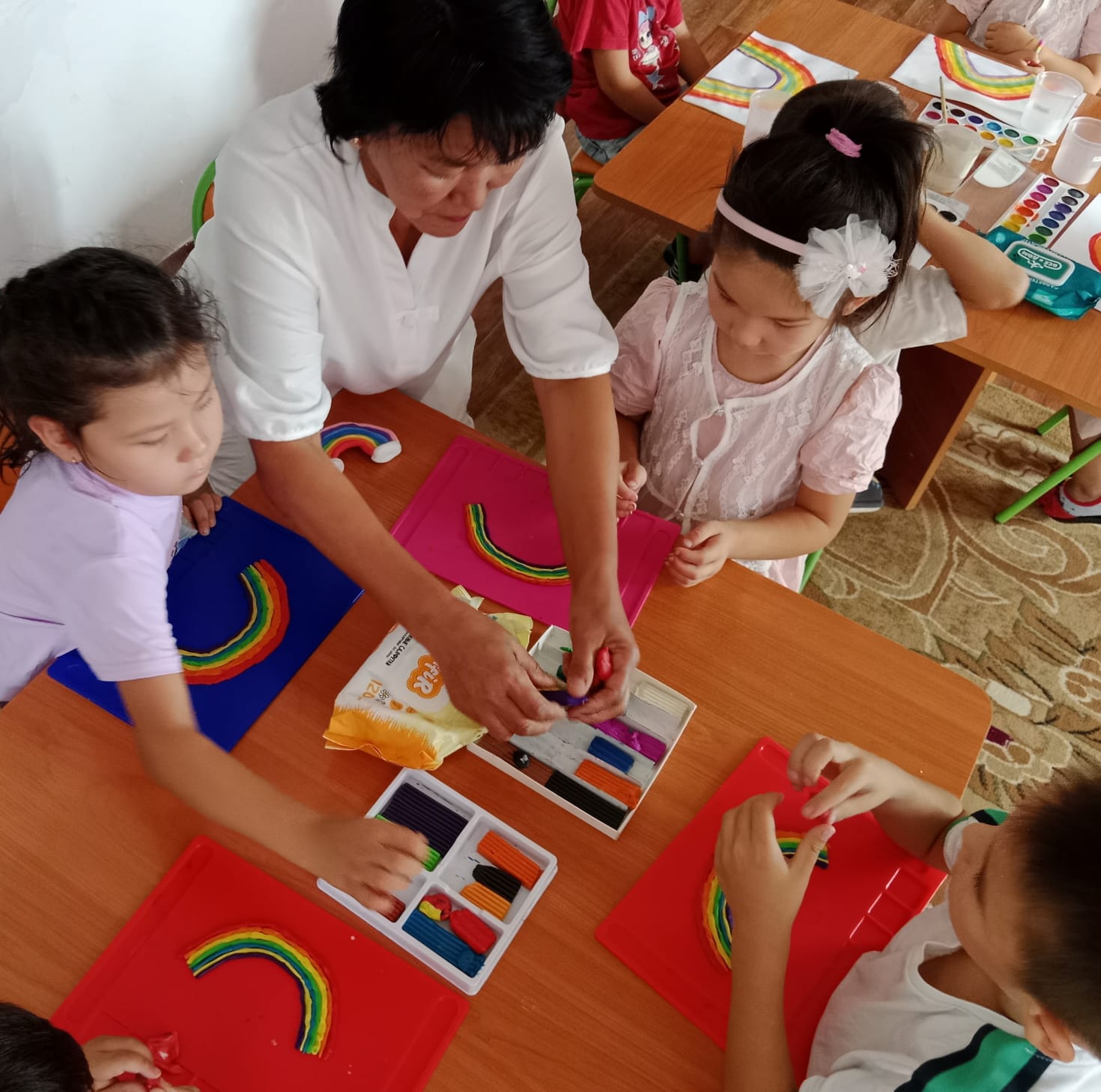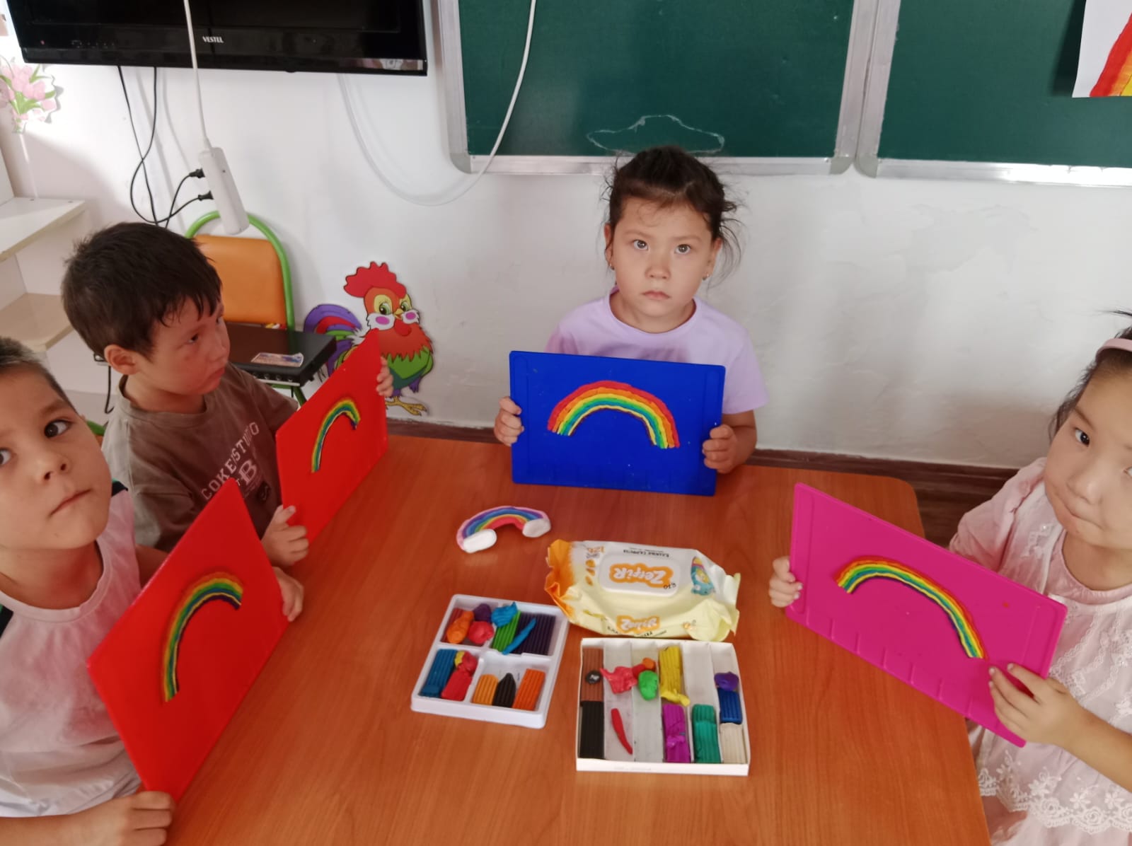 Ермексазды пайдалана отырып балалар Кемпірқосақты мүсіндеді.