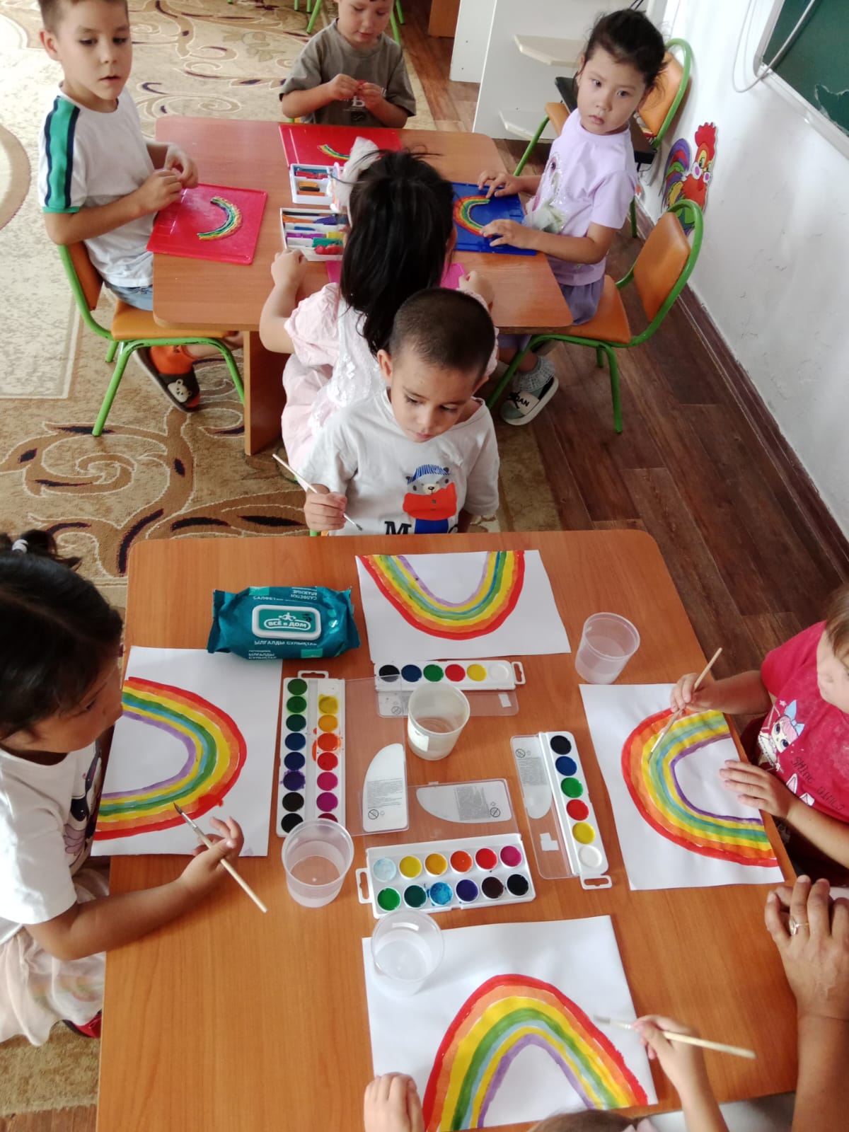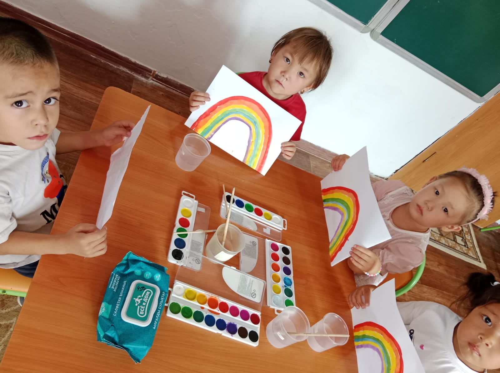 Балалар қызғылт ,сары,жасыл түстерді пайдалана отырып Кемпірқосақтың пішінін ескере отырып Ақ парақ бетіне бейнеледі.